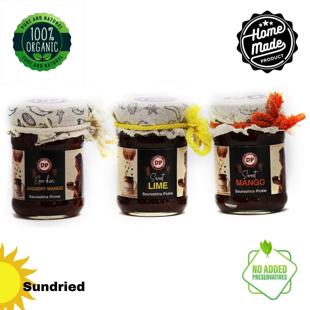 Divyaprabha Foods offers combo of its Sweet, Tangy, Spicy, Sour, Salty, Chatpata, & Masaledaar 3 different pickles, in 3 different jars, with 100 gms of each pickle., Gor-Keri (Jaggery-Mango) Pickle, Sweet Lemon Pickle & Special Sweet Mango Pickle | Sun-Dried. No Artificial Colours Or Preservatives | Organic & Homemade 100g each. Total 300g. Our homemade pickles add the unique Ghar ka achar flavour that reminds you of your grandmother's recipe "Baa nu athanu".